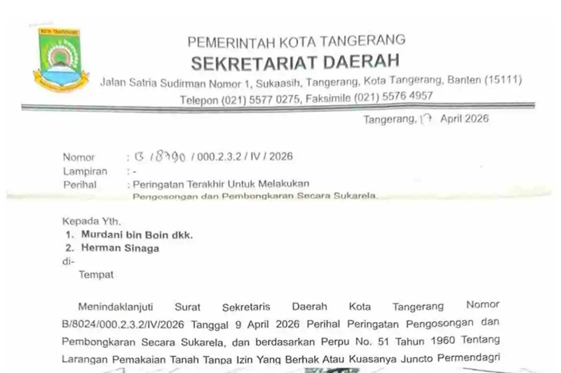 TANGERANG, FF – Nafas lega warga di sekitar Jalan Husen Sastranegara, Benda, seketika sesak. Sebuah surat peringatan berkode *318790/000.2.3.2 / IV/2026* mendarat di tangan H. Murdani bin Boin pada Jumat (17/4/26), memerintahkannya angkat kaki dalam waktu singkat dari lahan yang telah ia tempati selama hampir seperempat abad. Kasus ini menjadi potret terbaru benturan antara klaim aset negara dan hak penguasaan fisik tanah oleh warga sipil.